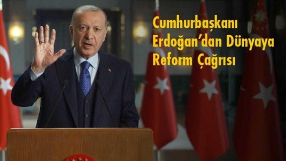 Türkiye olarak, bu reform ihtiyacının yıllardır "Dünya 5'ten büyüktür" ifadesiyle dile getirdiklerini belirten Erdoğan, "Bu konudaki somut tekliflerimizi kısa süre önce 'Daha Adil Bir Dünya Mümkün' diyerek milletimizle ve tüm dünyayla paylaştık. Böylece sadece eleştirilmek yerine, temsilde adaletin sağlandığı ve veto imtiyazının kaldırıldığı bir Birleşmiş Milletler için ilkeli, kapsamlı, stratejik ve uygulanabilir bir model sunduk. 76'ncı Birleşmiş Milletler Genel Kurulu sırasında yaptığımız görüşmelerde, ülkemizin bu çabalarının mâkes bulduğunu görmekten ayrıca memnuniyet duyduk. Tüm mazlum ve mağdurlar adına yürüttüğümüz bu mücadeleyi çok daha yukarılara taşımakta kararlıyız. İnsanı merkeze alan, adaleti ve hakkaniyeti önceleyen, güçlünün haklı olduğu değil, haklının güçlü olduğu küresel bir düzen kurulana kadar mücadelemizi sürdüreceğiz."