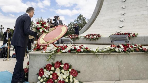 Cumhurbaşkanı Yardımcısı Fuat Oktay, Cumhurbaşkanlığı Külliyesi'nin karşısında bulunan 15 Temmuz Anıtı'na çelenk bıraktı.