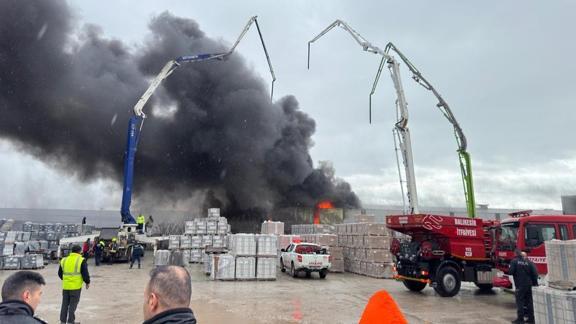 Balıkesir'de yapı malzemeleri deposunda çıkan yangın söndürülmeye çalışılıyor.