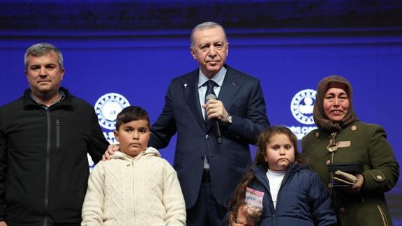 "Dünyada hemen hiçbir ülkenin altından kalkamayacağı, büyük bir inşa ve ihya hamlesine 2 yıl gibi kısa bir sürede imza attık. İki hafta önce, 201 bininci yuvamızın anahtarlarını Malatya'da teslim ettik. Son iki yılda deprem bölgemize 2,6 trilyon lirayı aşan yatırımlar yaptık. 2025 bütçemizde ise 584 milyar liralık kaynak tahsis ettik. İnşa edeceğimiz konutların tamamının yapımına başladık. Kalan 252 bin konut ve işyerimizi de hızlıca bitirip hak sahiplerine teslim edeceğiz. Böylelikle yılbaşına kadar toplam 453 bin konut, yani neredeyse yarım milyon konut yapacak ve evine girmeyen, işyerine kavuşmayan tek bir vatandaşımızı dahi bırakmayacağız."
