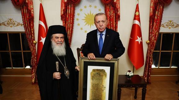 Başkan Erdoğan, Kudüs Rum Ortodoks Kilisesi Patriği Theofilos Giannopoulos'u kabulünde, İsrail'in Kudüs'teki tasarruflarının Kudüs'ün tarihi statüsüne ve kutsiyetine zarar vermeyi amaçladığını, Müslüman, Hristiyan ve Yahudi toplumunun bir arada yaşama geleneğini açıkça tehdit eden bu durumun kabul edilemez olduğunu bildirdi.