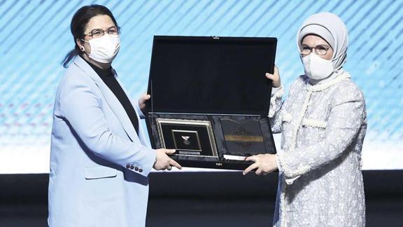 Aile Bakanı Derya Yanık Emine Erdoğan'a Himaye-i Etfal Cemiyeti Madalyası hediye etti.