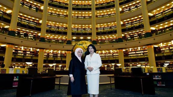 Kütüphanenin Cihannüma Salonu'na geçen lider eşleri, Güney Kore Kitaplığı'ndaki eserleri inceledi.