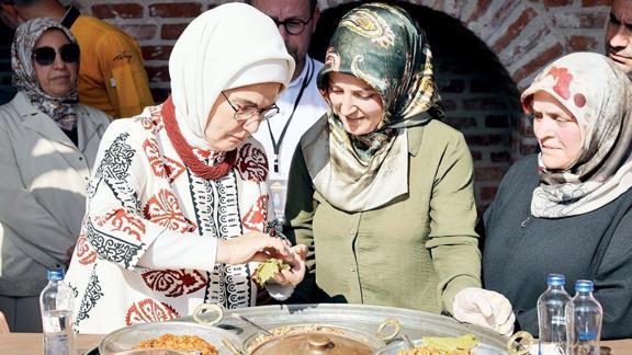 Başkan Erdoğan'ın eşi Emine Erdoğan, Tokat'ta düzenlenen "Gastronomi Festivali" etkinlikleri çerçevesinde "Bereket Hasadı" programına katıldı. Emine Erdoğan, "Dünya Bankasının verilerine göre, 2050'de dünya nüfusunun, 10 milyar olması bekleniyor. Böyle bir dünyada tarım, ülkelerin en üstün gücü olacak. Tarım kabiliyetimize ağrılık vermeli ve bilhassa genç nesillerin, tarıma yönelmelerini sağlamalıyız" dedi. Merkeze bağlı Endiz köyünde düzenlenen etkinlikte tarlanın girişinde bulunan tulumbadan su çeken Erdoğan, katılımcılara su ikram etti. Daha sonra Tokat'a özgü lezzetlerin sergilendiği stantları gezen Erdoğan, çökelinin tadına baktı. Tokat kebabının yapılışı ile ilgili bilgi alan Erdoğan, kuzu eti, kuyruk yağı, patlıcan ve patatesin takılı olduğu şişin kebap ocağına verilmesine yardımcı oldu ve çiftçi kadınlarla sarma da sardı.