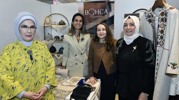 Beyoğlu'ndaki The Peninsula Oteli'nin fuaye alanında kurulan çarşıya gelen Emine Erdoğan, Aile ve Sosyal Hizmetler Bakanı Mahinur Özdemir Göktaş ve Dernek Başkanı Belma Sekmen ile stantları tek tek gezerek ürünleri inceledi.