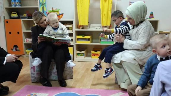 Emine Erdoğan ve Olena Zelenska, daha sonra Ukrayna-Rusya savaşı nedeniyle ülkelerinden ayrılmak zorunda kalan 10'u yetim, 2'si refakatçi personel çocuğu olmak üzere 12 Ukraynalı çocuğun kaldığı Eryaman Çocuk Evleri Sitesini gezerek, Müdür Serap Sağlam Tekneci'den bilgi aldı.