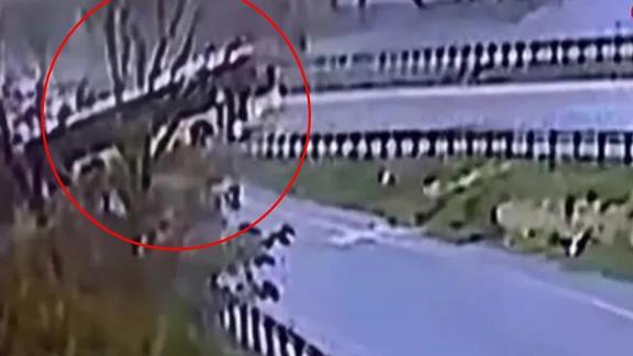 Görüntüde, yolda seyreden otobüsün ana yol ile yan yol ayrımına geldiğinde kontrolden çıkıp kayarak istikametini kaybetmesi yer alıyor.