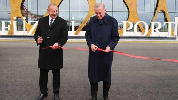 Bugün Ermenistan işgalinden kurtarılan Fuzuli'deki havalimanının açılışı için Azerbaycan'da bulunan Başkan Recep Tayyip Erdoğan ile Azerbaycan lideri İlham Aliyev, kısa sürede inşa edilen havalimanının kurdelesini birlikte kesti.