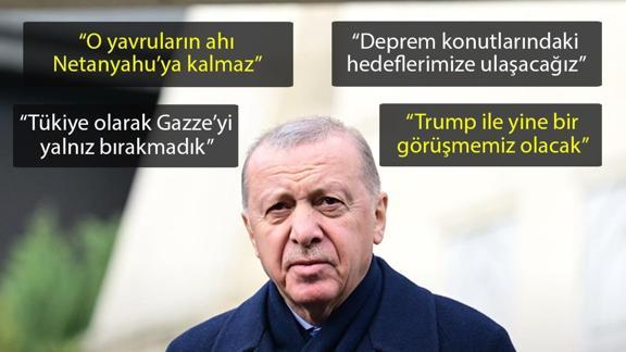 Erdoğan, bir gazetecinin, "2025 yılı deprem konutlarının, sosyal konutların konuşulduğu bir yıl oldu. Önümüzdeki yıl yeni hamleler olacak mı?" sorusu üzerine, o konuda hiç tereddüt olmadığını belirterek, "Bu konuda özellikle Çevre Bakanlığımız, yani Murat Bey tüm ekipleriyle bu çalışmalarını sürdürüyor ve böylece 11 ilimiz deprem ili olarak bu çalışmalarını sürdürüyor, sürdürecek. Deprem konutlarındaki hedeflerimize de ulaşacağız. Deprem konutlarının dışında da sosyal konutlarda da aynı gayretle yolumuza devam edeceğiz. 1+1, 2+1, 3+1 gibi projelerle yolumuza devam edeceğiz." diye konuştu.