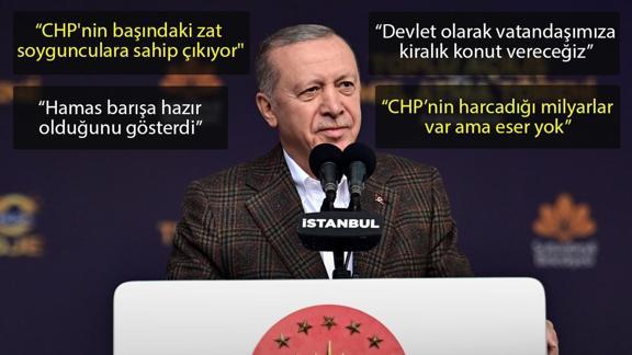 Cumhurbaşkanı Erdoğan, "Ortada harcanan milyarlar var ama eser yok, hizmet yok, icraat yok. Şimdi bunun hesabı yargımız tarafından sorulmasın mı? Meblağlar büyümüş ama sorunlar küçülmemiş hatta daha da artmış. Kesilen faturaların tutarı büyürken, hizmetin kalitesi değil, suç örgütünün banka hesapları büyümüş, ahtapotun kolları büyümüş, bavulların ebadı büyümüş, bir de döviz dolu baklava kutularının hacmi büyümüş. Yetimin, öksüzün, esnafın, emekçinin, emeklinin parası bir avuç soyguncu tarafından talan edilmiş, gasbedilmiş, birilerine peşkeş çekilmiş. Bu soygun düzenine bizzat kendileri göz yummuş. Şimdi bunlar ortaya dökülünce, CHP'nin başındaki zat 'siyasi operasyon' diyerek belediye soyguncularına sahip çıkıyor." ifadelerini kullandı.