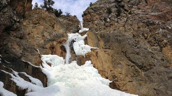 Geçtiğimiz günlerde gerçekleşen kar yağışının ardından geceleri hava sıcaklığının sıfırın altında 15 derecelere kadar düştüğü bölgede donan şelalenin görüntüsü Pamukkale travertenlerini andırdı.