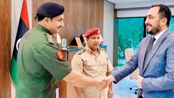 Libya Ulusal Ordusu Kara Kuvvetleri Komutanı ve Halife Hafter'in oğlu Korgeneral Saddam Halife Hafter, Türk Konsolosu Serkan Karmanlıoğlu ile bir araya geldi.