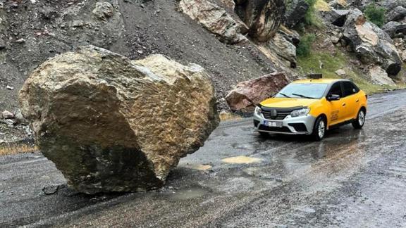 Derecik istikametine giden taksici Atalay, Şemdinli-Derecik kara yolunda seyir halindeyken yağışlar nedeniyle kopan kaya parçası önüne düştü.