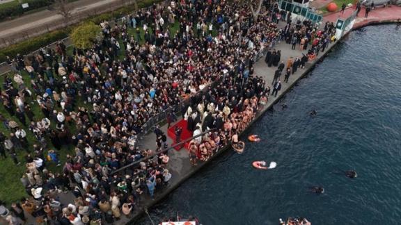 Töreni sahilden çok sayıda turist ve vatandaş da izledi. Öte yandan, haçı çıkarmak gerçekleştirilen kıyasıya yarış dronla görüntülendi.