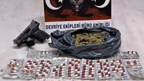 Yapılan üst aramasında şüphelilerde, 107 uyuşturucu hap, 65 gram esrar, ruhsatsız tabanca ile 15 bin 600 lira para ele geçirildi.