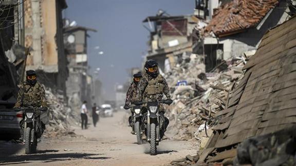Hatay'da görevlendirilen Emniyet Genel Müdürlüğü Özel Harekat Daire Başkanlığı bünyesindeki özel harekat polisleri, yıkılan binalar nedeniyle kapanan sokaklarda veya araç giremeyen mahallelerde kros motosikletleriyle devriye geziyor.