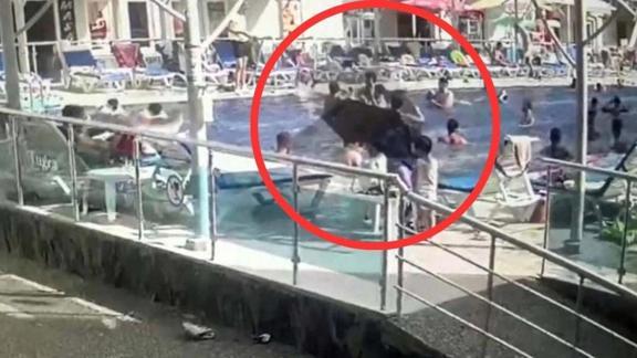 Antalya'nın Alanya ilçesinde havuz başında güneşlenmek için sandalyede oturan kadın, otelin çatısından başına baca kapağının düşmesi sonucu ağır yaralandı.