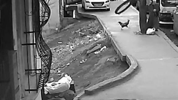 Taş ve tekme ile uzun süre horozu kovmaya çalışan kadının o anları ise güvenlik kamerasına yansıdı.