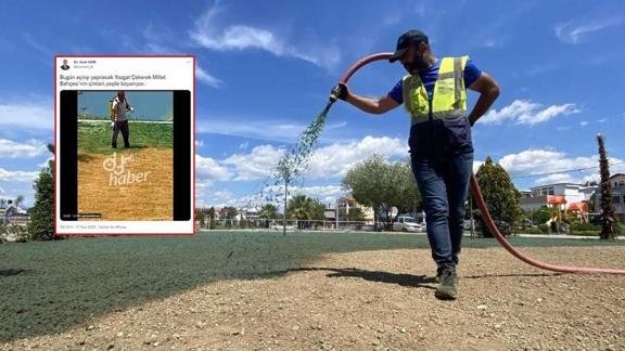 Yozgat Çekerek Millet Bahçesi'nde yapılan Hydroseeding uygulamasının görüntülerini sosyal medya hesabından paylaşan Fuat Sarı, "çimler yeşile boyanıyor" diyerek algı yapmaya çalıştı.