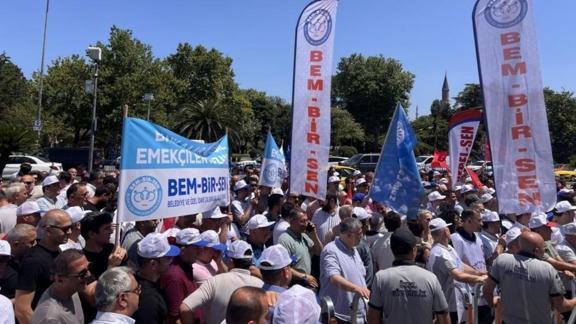 Hizmet-İş, Bem-Bir-Sen, Tes-İş, Tüm Bel-Sen, Tüm Yerel-Sen, Türk Yerel Hizmet-Sen ve Mühendis Tek-Sen üyesi işçiler ile temsilcileri, Saraçhane'deki İBB Başkanlık binasının önünde bir araya geldi.
