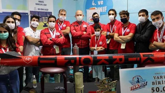 Roket yarışmasında dereceye girenlere ödüllerini veren Bakan Soylu, yarışmacılarla birlikte asker selamı verdi.