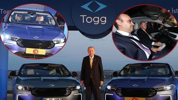Başkan Erdoğan, plakasına Cumhurbaşkanlığı forsu takılan Togg'un mavi renkli yeni modeliyle test sürüşü yaparken, araç hakkında bilgi aldı.