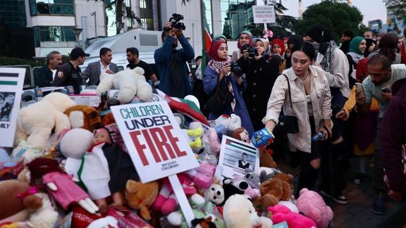 Yeryüzü Çocukları Derneği öncülüğündeki sivil toplum kuruluşlarına üye bir grup, Gazze'de katledilen çocuklara dikkati çekmek için İsrail'in İstanbul Başkonsolosluğu önüne oyuncak bıraktı.