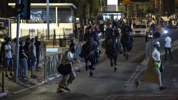 Gerginliğin artması üzerine İsrail polisi, Filistinlileri dağıtmak için TOMA ile atlıları devreye soktu.