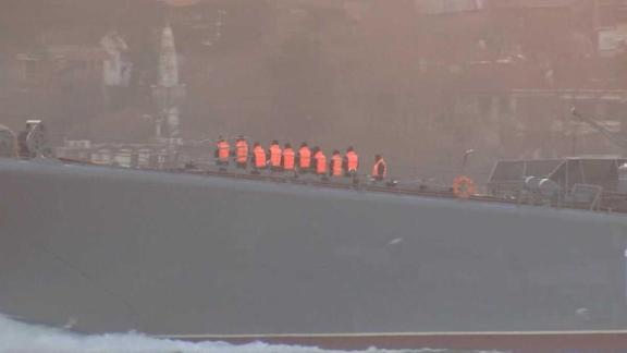 Savaş gemisinin boğaz geçişine iki sahil güvenlik botu da eşlik etti. Yaklaşık 1 saatte FSM Köprüsü altına ulaşan geminin güvertesinden çok sayıda Rus askerinin tek sıra halinde dizildiği gözlendi. Bazı askerler geminin ön ve arka bölümünde silahlı nöbet tuttuğu görüldü.