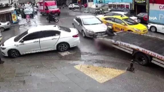 Pendik'te bir motokurye, trafikte tartıştığı sürücüye ait otomobilin aynasını kırdı. Duruma sinirlenen araç sürücüsü, otomobilini motokuryenin üzerine sürdü. Çarpmanın etkisiyle sürüklenerek otomobil ile park halindeki çekicinin arasında ezilen motokurye yaralandı.