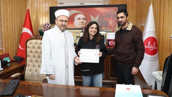 Üstündağ, tebrik ettiği kadına ihtida belgesi, Kur'an-ı Kerim ve ilmihal hediye etti.