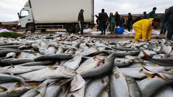 Diğer teknelerin yardımıyla kıyıya çekilen ağlardan çıkarılan 4 ila 10 kiloluk balıklar, yeteri kadar kasa olmadığı için barınağa döküldü. Buzlanarak kamyonetlere yüklenen balıklar İzmir Su Ürünleri Hali'ne götürüldü.