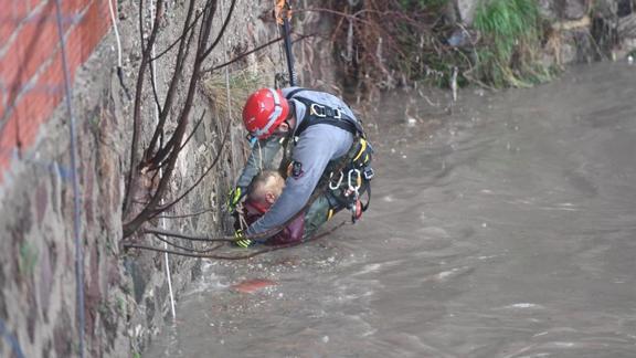 Bölgeye yönlendirilen itfaiye ekipleri, su seviyesinin yaklaşık 2 metreye ulaştığı dereye vinç yardımıyla indi.