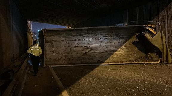 TEM Otoyolu çıkışı Selvi Caddesi Kağıthane istikametinde ilerleyen 34 EA 5825 plakalı hafriyat kamyonu, açılan damperinin köprüye çarpması sonucu devrildi.