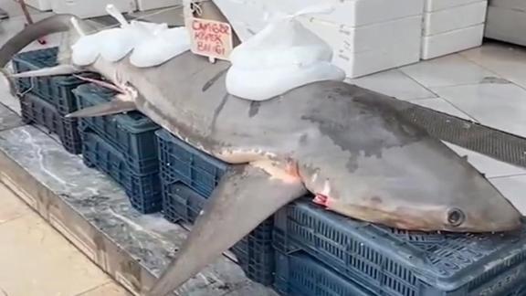 Gökalp, tututtukları köpekbalığını Adana'daki balıkçı dükkanında sergilemeye başladı.