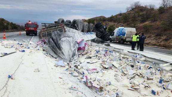 Edinilen bilgiye göre, A.K. (52) idaresindeki 42 CUM 01 plakalı Mercedes marka un yüklü tır, sürücüsünün direksiyon hâkimiyetini kaybetmesi sonucu kontrolden çıkarak devrildi. Dorsede bulunan paketler hâlindeki tonlarca un ise etrafa saçıldı.
