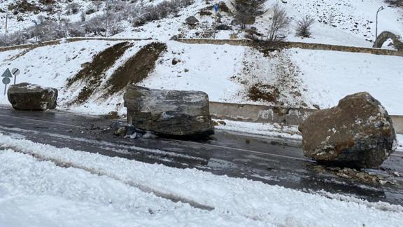 Çatak-Van kara yolunun 5'inci kilometresinde dağdan koparak yola düşen dev kaya parçaları nedeniyle yol trafiğe kapandı.