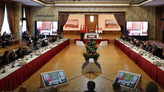 "Ama bundan da önemlisi, daha evvel de ifade ettiğim gibi, burada söz alan her bir arkadaşımız Türkiye'de toplumsal mutabakatın oluşmasına, toplumsal rızanın gelişmesine şimdiye kadar çok büyük katkı sundular, bundan sonra da sunmaya devam edecekler. Ümit ediyorum ki en kısa zamanda sadece Türkiye'de silahların sustuğu bir ortam değil, bütün bölgede silahların sustuğu, kardeşliğin hakim olduğu, insanlar arasındaki etnik, mezhebi ve siyasi farklılıkların çatışma sebebi değil, bir bütünleşme ve birleşme vesilesi haline dönüştürüldüğü bir Türkiye'yi ve bir bölgeyi inşa ederiz.