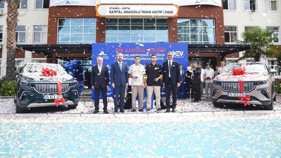 YKS Sözel Türkiye 3'üncüsü ve Eşit Ağırlık Türkiye 22'ncisi Safa Murat Çelik ile Sözel Türkiye 2'ncisi ve Yabancı Dil Testi Türkiye 6'ncısı Yasin Yazıcı'ya Togg marka otomobil hediye edildi.