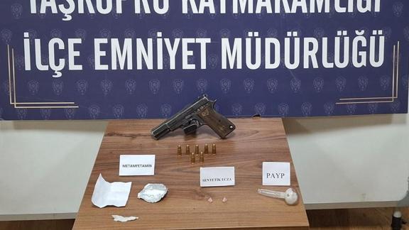 Aramada sentetik uyuşturucu ile uyuşturucu içiminde kullanılan düzenek ve ruhsatsız tabanca ele geçirildi.