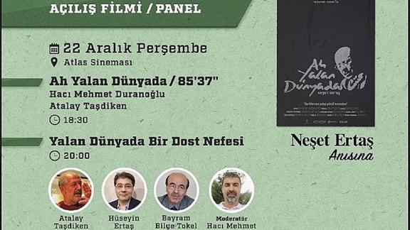 Festival açılışı ise Atalay Taşdiken ve Hacı Mehmet Duranoğlu'nun Neşet Ertaş anısına yaptığı "Ah Yalan Dünyada" isimli belgesel gösterimi ile yapılacak. Gösterimin ardından düzenlenecek panelde Neşet Ertaş'ın oğlu Hüseyin Ertaş, yakın arkadaşı Bayram Bilge Tokel ve Atalay Taşdiken, Festival Başkanı Faysal Soysal'ın moderatörlüğünde konuşmacı olacak. 22 Aralık Perşembe günü saat 18.00'da Atlas 1948 Sineması'nda başlayacak etkinliğe dileyen herkes katılabilecek.