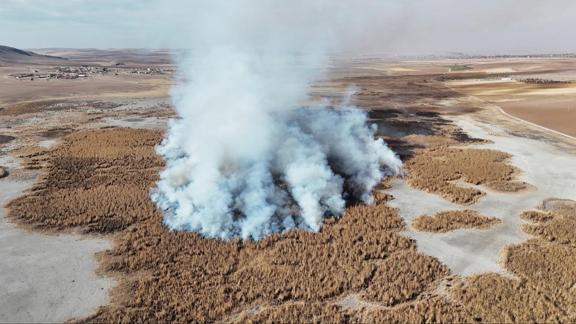 İlçenin 24 kilometre batısında Tuz Gölü Havzası içinde yer alan ve geçen yıl tamamen kuruyan göldeki sazlık alanda, iki gün önce henüz bilinmeyen nedenle yangın çıktı.