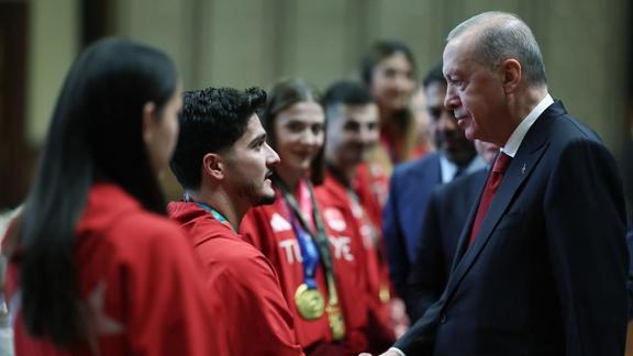 Başkan Erdoğan, 2020-2025 yıllarında düzenlenen Avrupa ve dünya şampiyonaları ile olimpiyatlarda tekvando, halter ve karate branşlarında başarı gösteren sporcuları Cumhurbaşkanlığı Külliyesi'nde kabul etti.