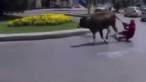 Zeytinburnu'nda kaçan danayı kuyruğundan tutarak durdurmaya çalışan kurban sahibi bir süre sürüklendi.