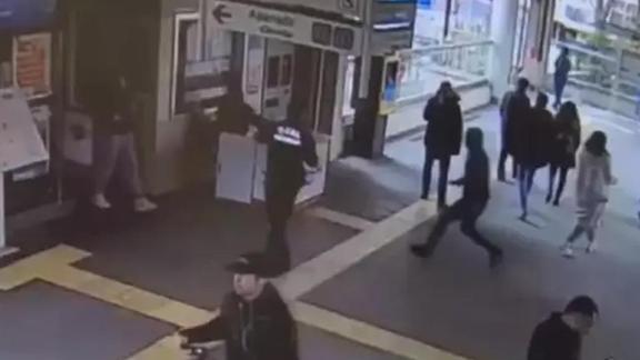 Güvenlik kamerasınca kaydedilen görüntülerde, istasyon girişindeki görev alanında oturan G.K'ye hızla yaklaşan şüphelinin saldırması, çevredekilerin engelleme çabalarına rağmen kadın güvenlik görevlisini bıçaklaması yer aldı.