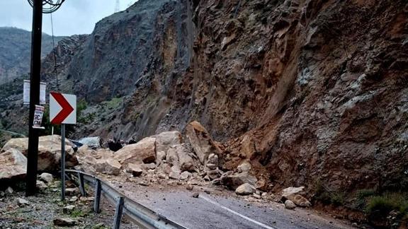 Yamaçtan kopan kaya parçaları ve toprak birikintisinin sürüklendiği kara yolu, çift yönlü ulaşıma kapandı.