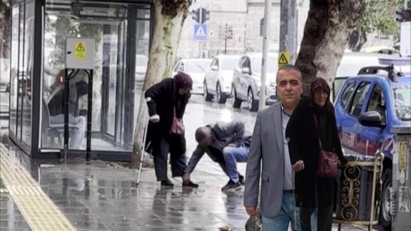 Maaşını çekmek için bankaya girecek annesinin kara lastik ayakkabısının yağmur nedeniyle çamurlu olduğunu fark eden Teselek, o halde içeri adım atmasını istemedi. Kaldırımda biriken yağmur suyuyla ayakkabıyı silip çamurdan temizleyen evladın o anlarını bir vatandaş kamerayla görüntüledi.