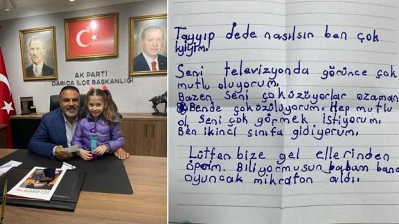 Başkan Recep Tayyip Erdoğan'a olan sevgisini içten ifadelerle kaleme alan Zeynep Erva Şen'in mektubunu teslim alan AK Parti Darıca ilçe Başkanı Köksal Şakar, "Yarınlarınızın teminatı çocuklarımızın isteklerini hiçbir zaman göz ardı etmedik. Cumhurbaşkanımız Sayın Recep Tayyip Erdoğan'a duyduğu sevgiyi ve ona olan bağlılık duygularını samimi ifadelerle kaleme alarak Tayyip dedesine yazmış olduğu mektubu teslim aldık, kıymetli kardeşimiz Zeynep Erva Şen'i misafir ettik. Rabbim; Hayırlı, huzurlu, başarılı uzun ömürler versin, iyi ki varsın" dedi.