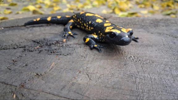 Nesli tükenme tehlikesi altında olduğu için öncelikli korunan türlerden olan sarı benekli semender, bir süre evin çevresinde dolaştıktan sonra bölgeden uzaklaştı.