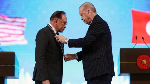 Başkan Erdoğan, törende, iki ülkenin milli marşlarının okunmasının ardından Malezya Başbakanı Enver'e Cumhuriyet Nişanı'nı tevcih etti.